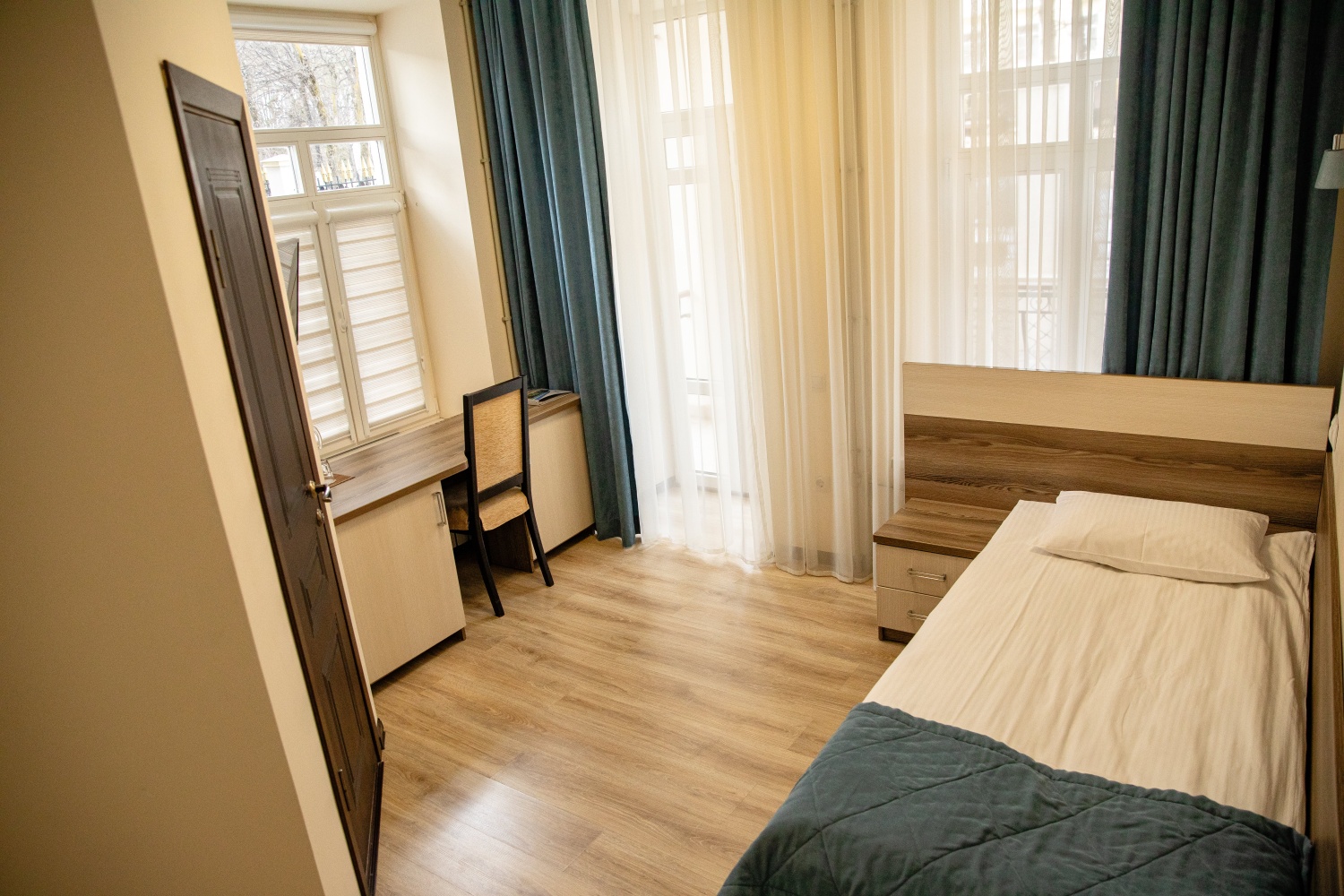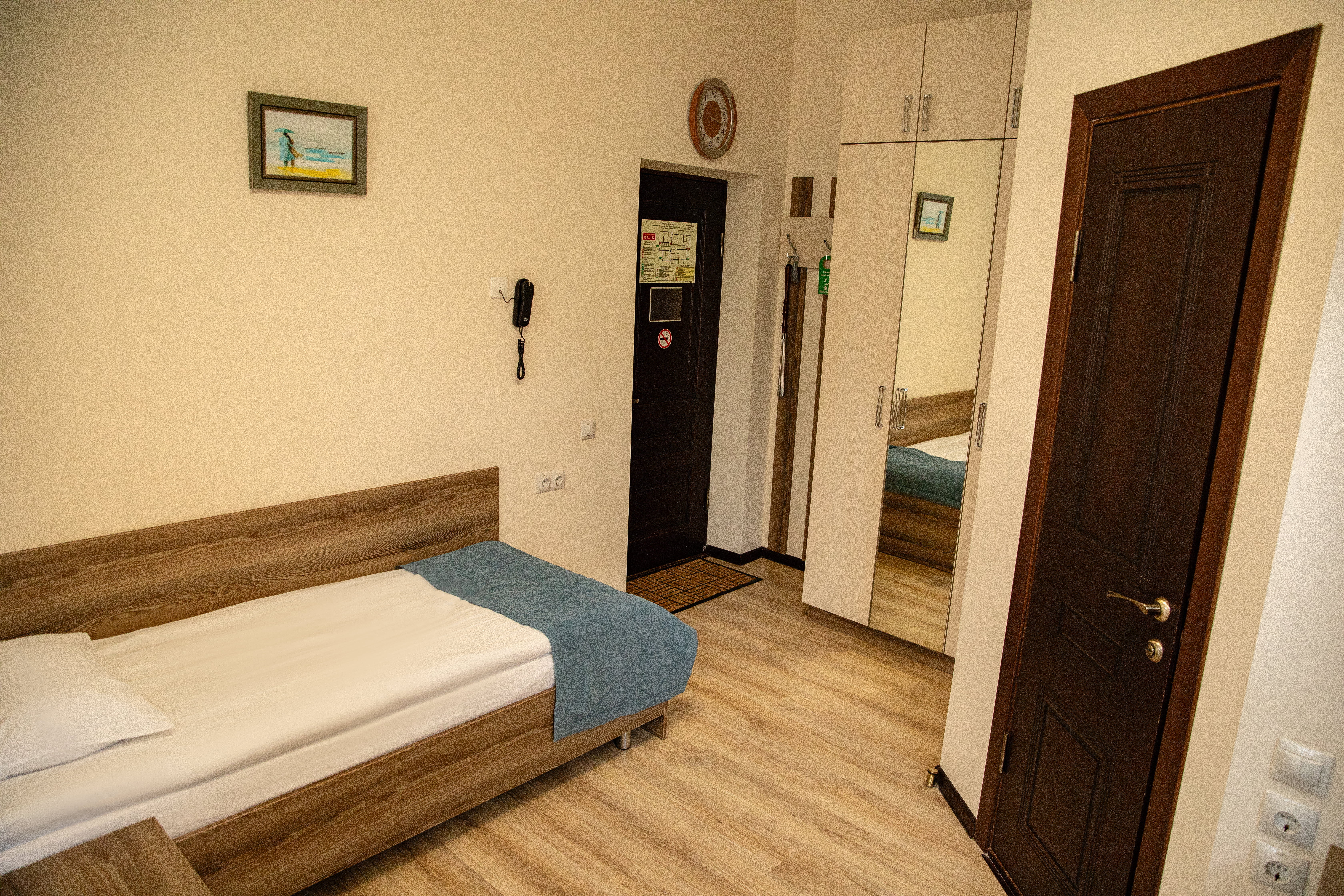 Номер первой категории "Одноместный" во 2 корпусе — это новый уютный номер с современным оснащением. Идеален при одноместном размещении. Вся обстановка располагает к неспешному отдыху. В номере есть рабочая зона, а также собственный балкон с легкими ажурными решетками. Оснащение номера способно удовлетворить все требования отдыхающих, каждый номер обязательно оснащён сплит-системой для комфорта в летний период. Выполненный в спокойных тонах интерьер номера, а также наше качественное обслуживание помогут приобрести только самые позитивные и благоприятные эмоции от отдыха.