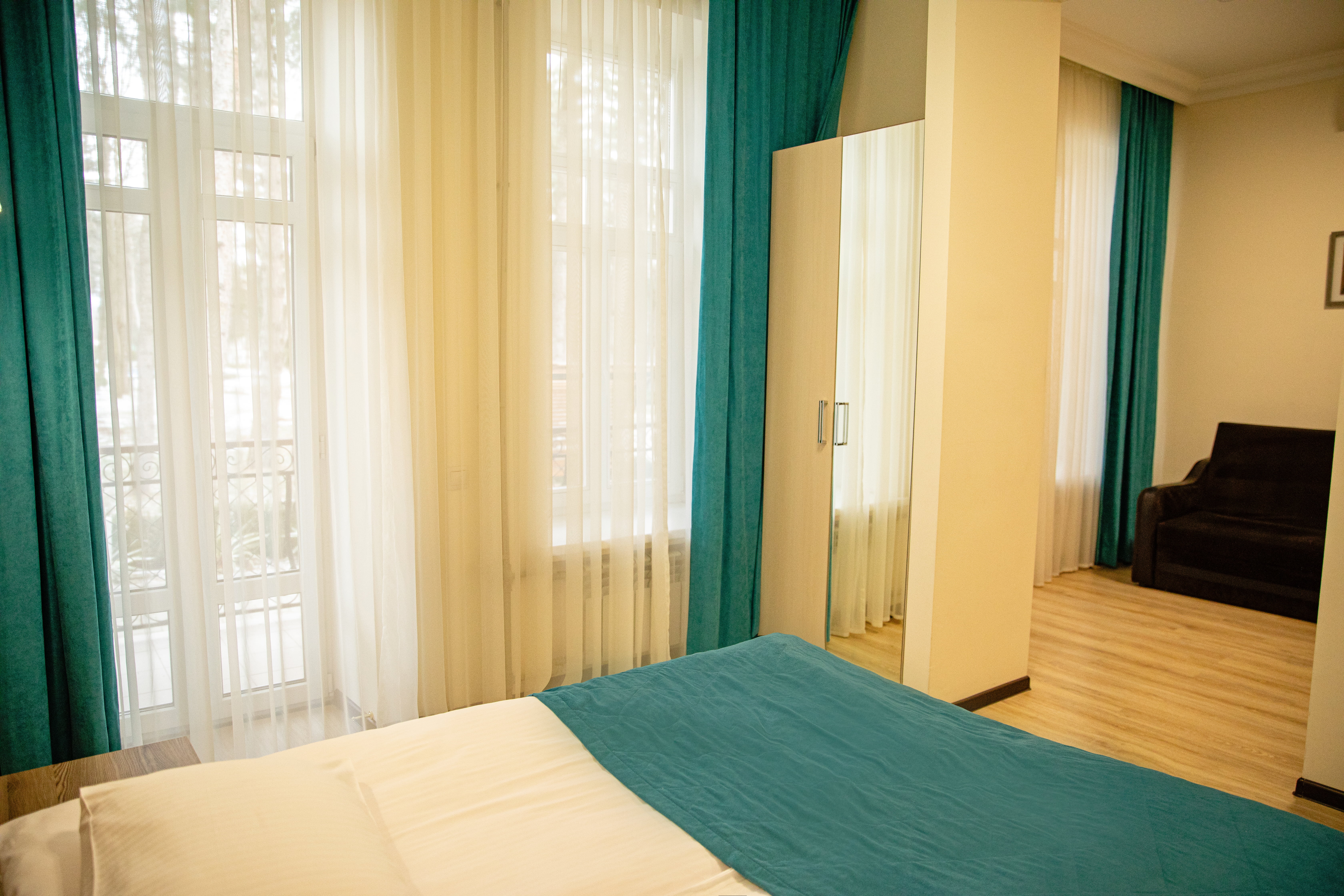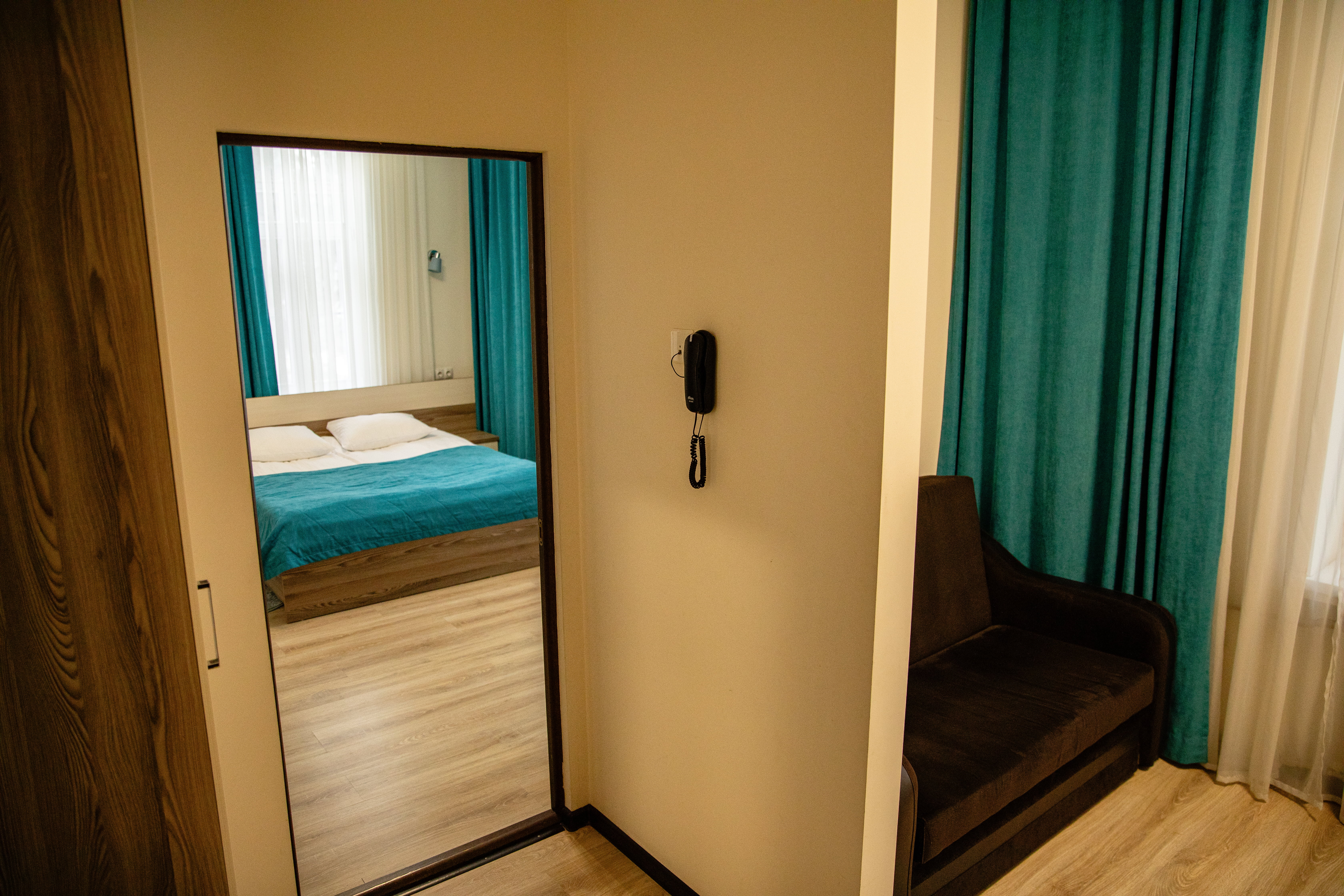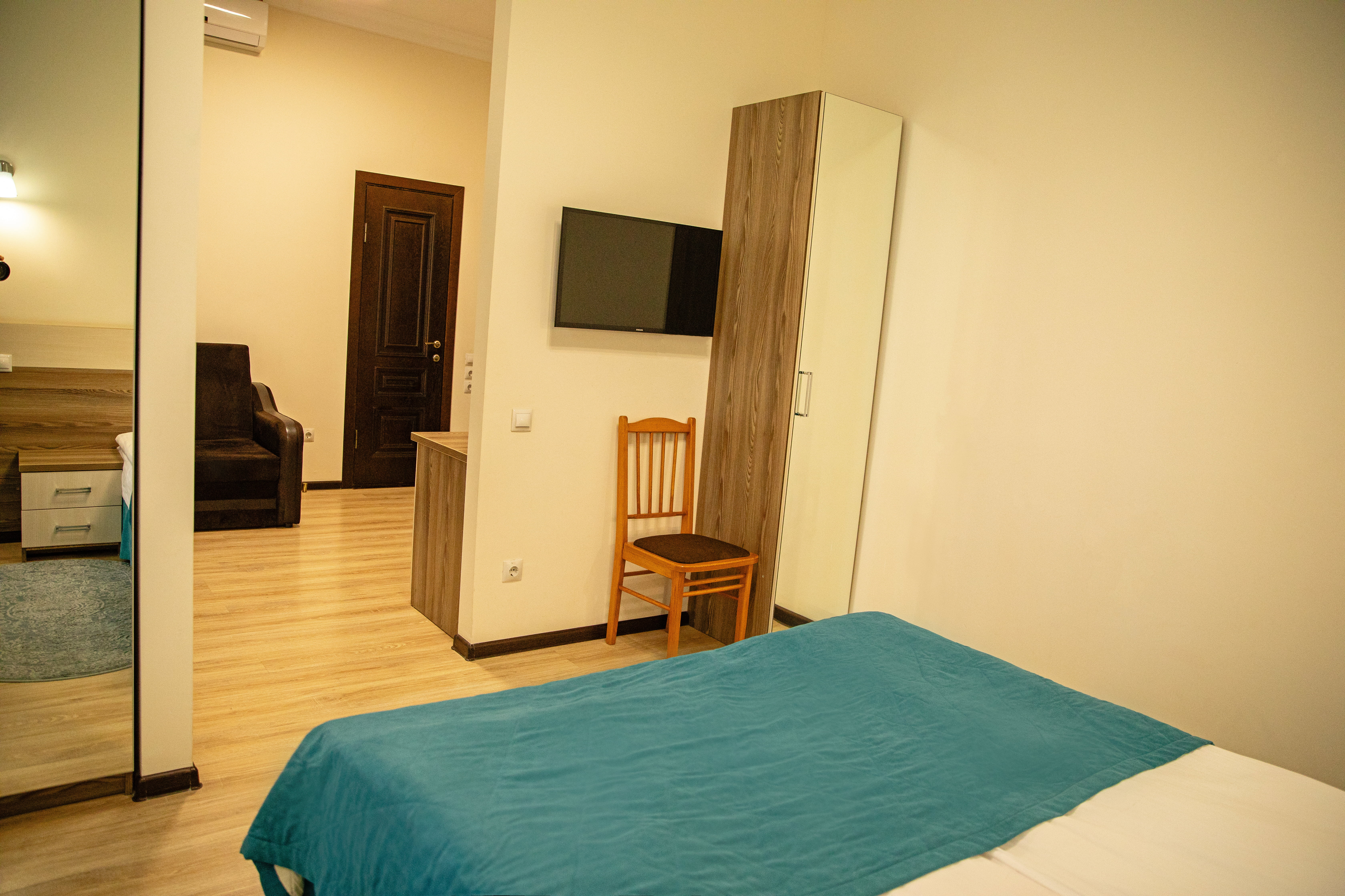 Номер первой категории "Семейный" - это новый комфортабельный, уютный номер с современным оснащением для спокойного отдыха с детьми. Номер разделен на две зоны: спальная с великолепной двуспальной кроватью, в которой ваш отдых будет полноценным, и гостиная с раскладывающимся диваном и телевизором, каждый номер обязательно оснащён сплит-системой для комфорта в летний период. В номере есть собственные балконы с легкими ажурными решетками. В гостиную комнату вы сможете пригласить своих друзей или же оборудовать ее под рабочее место, если дела застали вас врасплох на отдыхе.