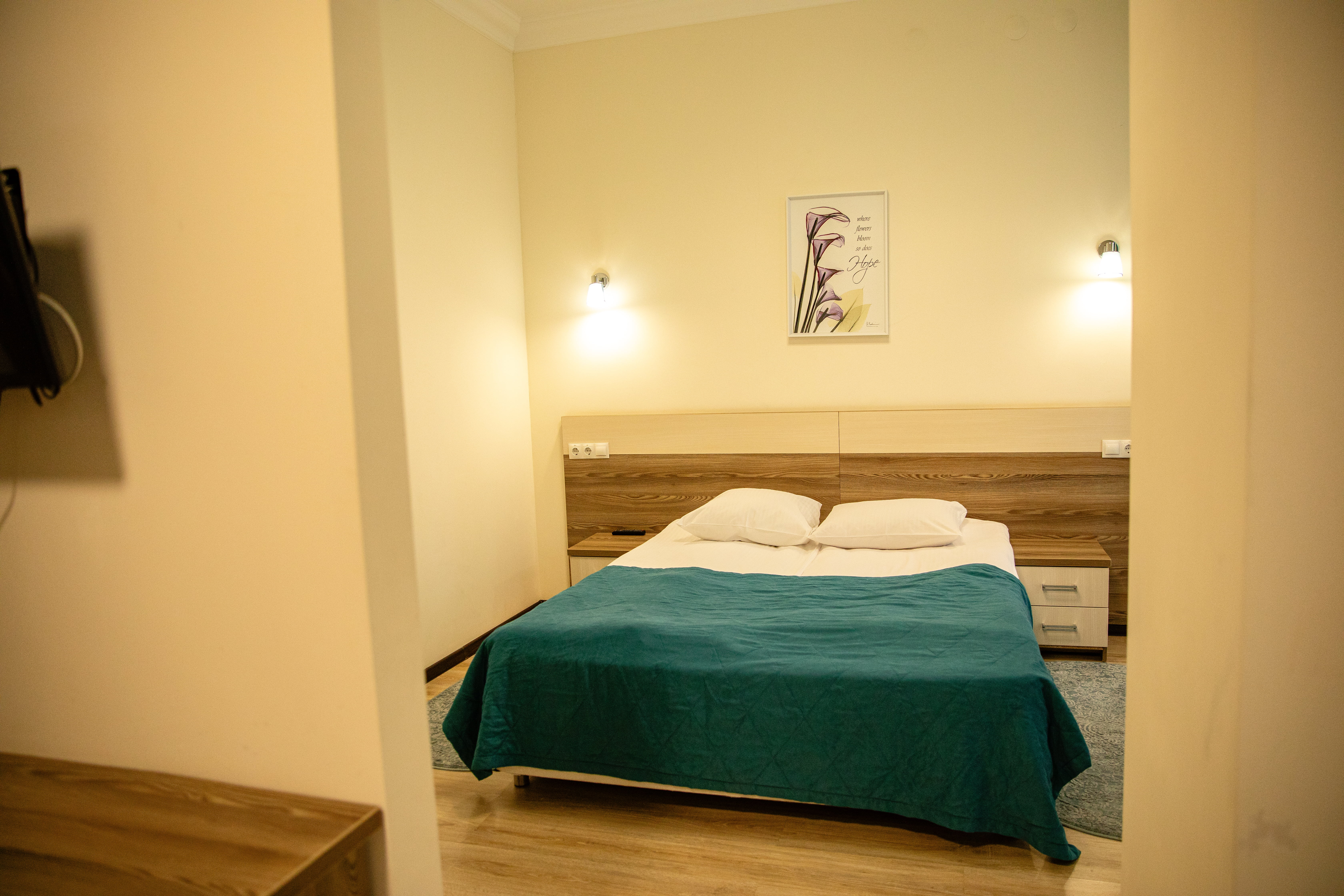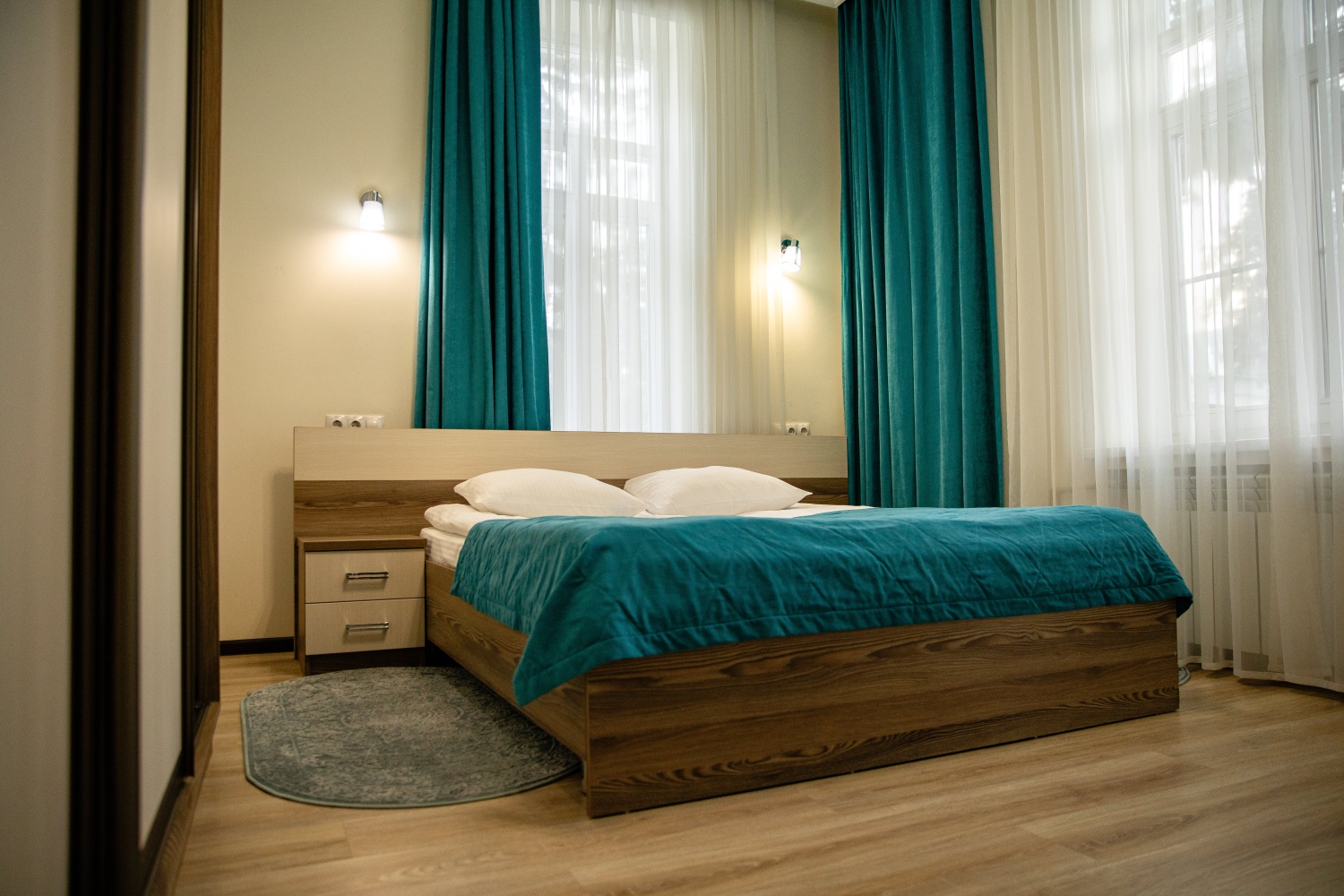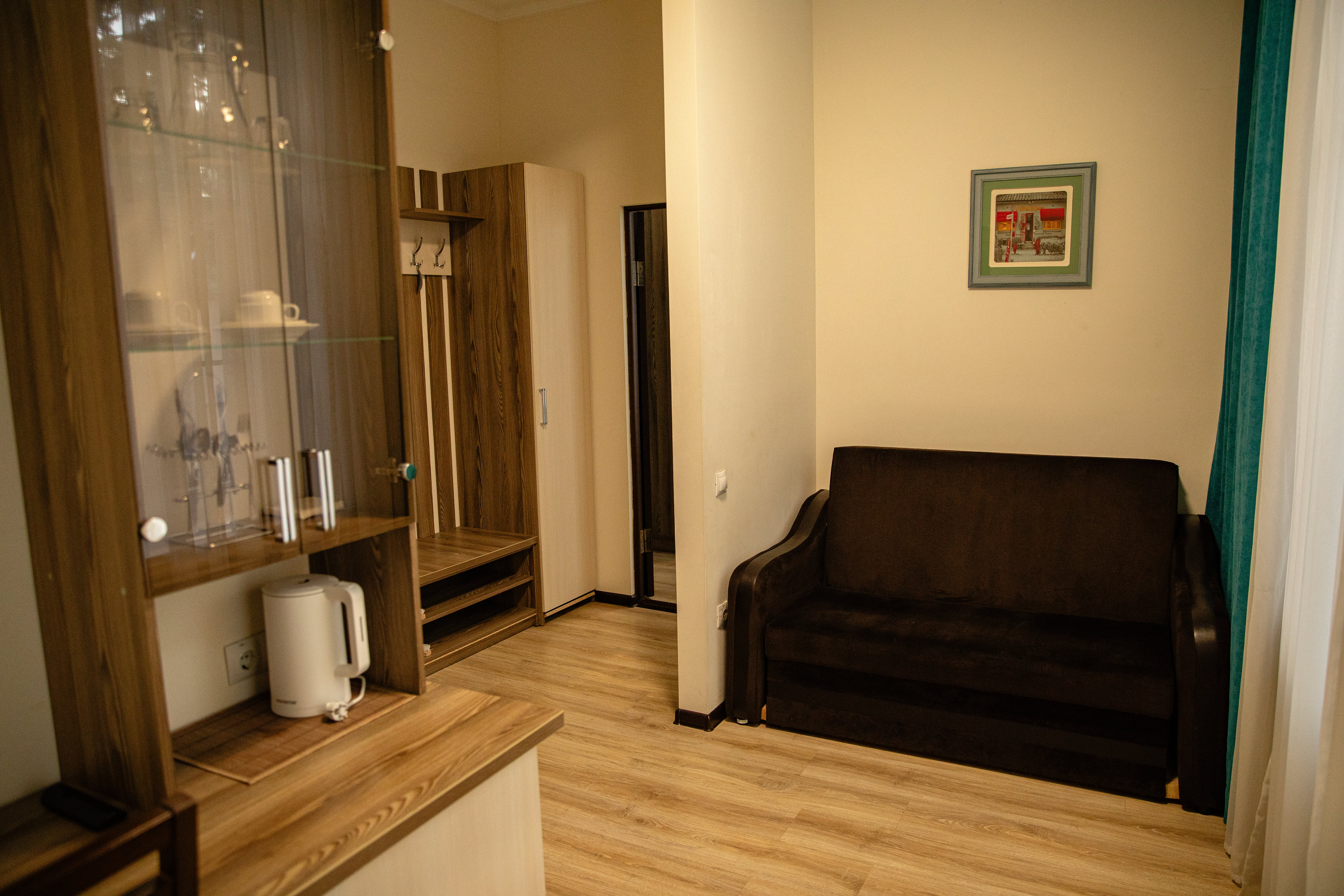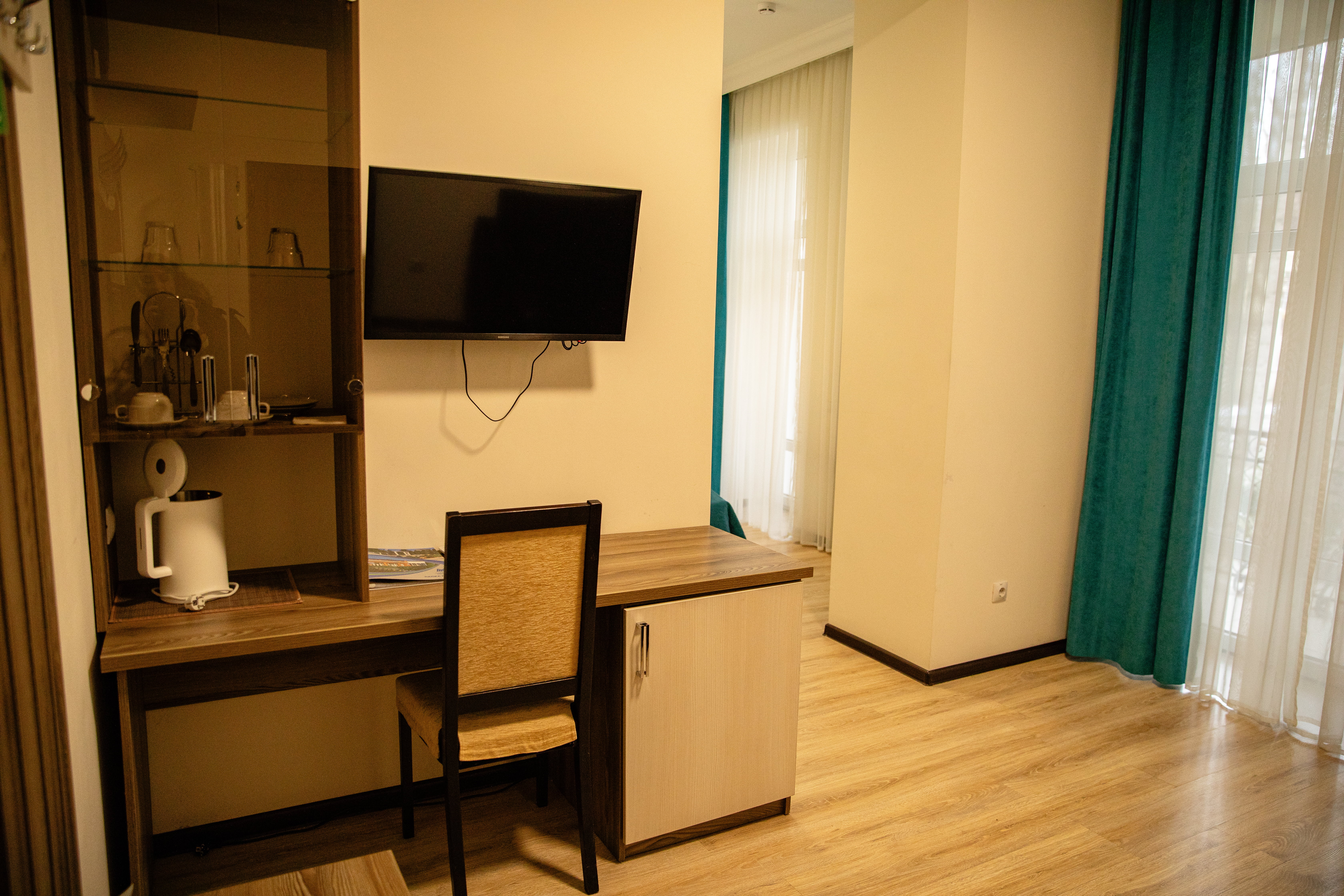 Номер первой категории "Семейный" - это новый комфортабельный, уютный номер с современным оснащением для спокойного отдыха с детьми. Номер разделен на две зоны: спальная с великолепной двуспальной кроватью, в которой ваш отдых будет полноценным, и гостиная с раскладывающимся диваном и телевизором, каждый номер обязательно оснащён сплит-системой для комфорта в летний период. В номере есть собственные балконы с легкими ажурными решетками. В гостиную комнату вы сможете пригласить своих друзей или же оборудовать ее под рабочее место, если дела застали вас врасплох на отдыхе.